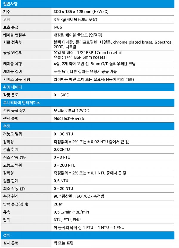 TurbiTechw©÷ D-ISO Turbidity Sensor TurbiTechw©÷ LR ¼¾¼ÀÇ ¼º°øÀ» ¹ÙÅÁÀ¸·Î Á¦Ç° ¹üÀ§¸¦ °³¼±Çϰí È®ÀåÇϱâ À§ÇØ PartechÀº »õ·Î¿î TurbiTechw©÷ D-ISO ¼¾¼¸¦ °³¹ßÇÏ¿´½À´Ï´Ù. D-ISO´Â °³¹ß Ãø¸é¿¡¼ ÀÚ¿¬½º·¯¿î ÁøÈ·Î¼, ±âÁ¸ °í°´ÀÇ ¼ÒÁßÇÑ Çǵå¹éÀ» »ç¿ëÇÏ¿© °³¹ßµÇ¾ú½À´Ï´Ù. 40³âÀÇ ¼¾¼ ¼³°è ³ëÇϿ츦 »ì·Á, ¾ÈÁ¤ÀûÀÎ ¿µÁ¡À» º¸ÀåÇϱâ À§ÇØ ¹Ì±¤À» Æ÷ÂøÇÏ´Â »õ·Î¿î ¼¾¼¸¦ °³¹ßÇÏ¿´À¸¸ç, è¹ö ³»ºÎ¿Í ÁÖº¯¿¡ ¿À¿° ¹°ÁúÀÌ ½×ÀÌ´Â °ÍÀ» ¹æÁöÇÏ´Â »õ·Î¿î ÀÚµ¿ ¼¿ÇÁÅ©¸®´× ¸ÞÄ¿´ÏÁòÀ» ÀÌ ³·Àº ¹üÀ§ÀÇ Å¹µµ ÃøÁ¤¿¡ Àû¿ëÇÏ¿´½À´Ï´Ù. ¸Å¿ì ¹Î°¨ÇÑ ¼¾¼·Î 0.01 NTU ¹Ì¸¸ÀÇ Å¹µµ º¯È¸¦ °¨ÁöÇÒ ¼ö ÀÖ½À´Ï´Ù. ±¤ »ê¶õ ±â¼úÀÇ ±Û·Î¹ú Ç¥ÁØÀ¸·Î ¼¾¼¸¦ ´õ ³ÐÀº ¹üÀ§ÀÇ ÀÔÀÚ Å©±â¿¡ ¹Î°¨ÇÏ°Ô ¸¸µì´Ï´Ù. ¼¾¼´Â µµ±¸³ª ±³À°ÀÌ ÇÊ¿ä ¾øÀÌ À¯Áö °ü¸®°¡ °ÅÀÇ ÇÊ¿äÇÏÁö ¾Ê½À´Ï´Ù. º¸Á¤Àº ½À½Ä ʵµ Ç¥ÁØ ¶Ç´Â °¢ ¼¾¼¿Í ÇÔ²² Á¦°øµÇ´Â °Ç½Ä º¸Á¤ ·¹ÆÛ·±½º ¼¿À» »ç¿ëÇÏ¿© ¼öÇàÇÒ ¼ö ÀÖ½À´Ï´Ù. ·¹ÆÛ·±½º ¼¿Àº ÈÇРǥÁذú °ü·ÃµÈ ºñ¿ë ÁöÃâÀÌ ¾øÀ¸¸ç, °íÀ¯ ¿ÀÂ÷µµ ¹ß»ý½ÃŰÁö ¾Ê°í ¸Å¿ì ½±°í ¹Ýº¹ °¡´ÉÇÑ ¼¾¼ ¼º´É º¸Á¤ ¹æ¹ýÀ» Á¦°øÇÕ´Ï´Ù. ![]() ƯÀåÁ¡ ¡¤ °ÇÁ¶ 2Â÷ Ç¥ÁØ ¹°Áú (Dry secondary standard) ¡¤ ¾ÆÁÖ ³·Àº ÈÄ¹æ ±¤»ê¶õ ¡¤ ÀÚµ¿¼¼Ã´ ¼¾¼ ÃøÁ¤¿ø¸® ¡¤ 90¡Æ ±¤ »ê¶õ ¡¤ ISO7027 ±ÔÁ¤ Áؼö ![]() ÀÀ¿ëºÐ¾ß ¡¤ ¿ø¼ö ¸ð´ÏÅ͸µ ¡¤ °øÁ¤Á¦¾î ¡¤ ÃÖÁ¾ ¹æ·ù¼ö ¸ð´ÏÅ͸µ ¡¤ ¿©°ú¼ö ¸ð´ÏÅ͸µ ¡¤ ¿ª¼¼ ¿©°ú Á¦¾î ¡¤ Clarifier ºÎÀ¯¹° ¸ð´ÏÅ͸µ ȣȯ¸ð´ÏÅÍ ¡¤ 7300w©÷ ¸ð´ÏÅÍ ¾Ç¼¼¼¸® ¡¤ ±âÆ÷ Á¦°Å±â ÁÖ¹®Á¤º¸ ¡¤ 227981 TurbiTechw©÷ D-ISO Sensor (Range: 0-30 NTU, Cable Length: 5 metres) ¡¤ 229948 TurbiTechw©÷ D-ISO Sensor (Range: 0-200 NTU, Cable Length: 5 metres)