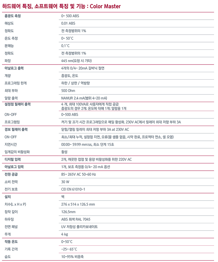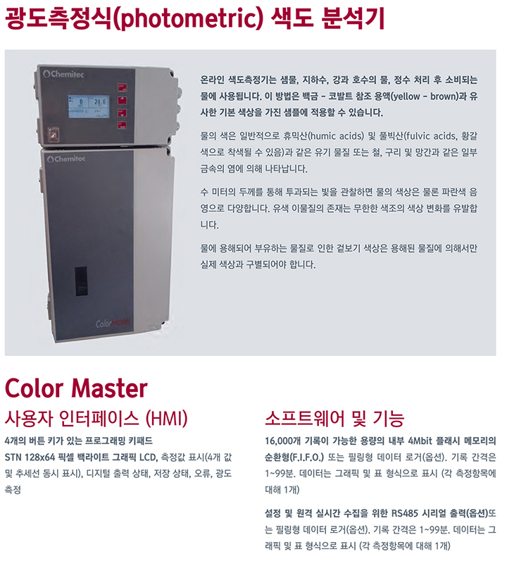 ¿Â¶óÀÎ »öµµ ºÐ¼®±â±â Color Master ¿Â¶óÀÎ »öµµÃøÁ¤±â´Â »ù¹°, ÁöÇϼö, °°ú È£¼öÀÇ ¹°, Á¤¼ö ó¸® ÈÄ ¼ÒºñµÇ´Â ¹°¿¡ »ç¿ëµË´Ï´Ù. ÀÌ ¹æ¹ýÀº ¹é±Ý - ÄÚ¹ßÆ® ÂüÁ¶ ¿ë¾×(yellow - brown)°ú À¯»çÇÑ ±âº» »ö»óÀ» °¡Áø »ùÇÿ¡ Àû¿ëÇÒ ¼ö ÀÖ½À´Ï´Ù. ¹°ÀÇ »öÀº ÀϹÝÀûÀ¸·Î È޹ͻê(humic acids) ¹× Ç®ºò»ê(fulvic acids, Ȳ°¥»öÀ¸·Î Âø»öµÉ ¼ö ÀÖÀ½)°ú °°Àº À¯±â ¹°Áú ¶Ç´Â ö, ±¸¸® ¹× ¸Á°£°ú °°Àº ÀϺΠ±Ý¼ÓÀÇ ¿°¿¡ ÀÇÇØ ³ªÅ¸³³´Ï´Ù. ¼ö ¹ÌÅÍÀÇ µÎ²²¸¦ ÅëÇØ Åõ°úµÇ´Â ºûÀ» °üÂûÇÏ¸é ¹°ÀÇ »ö»óÀº ¹°·Ð ÆÄ¶õ»ö À½¿µÀ¸·Î ´Ù¾çÇÕ´Ï´Ù. À¯»ö À̹°ÁúÀÇ Á¸Àç´Â ¹«ÇÑÇÑ »öÁ¶ÀÇ »ö»ó º¯È¸¦ À¯¹ßÇÕ´Ï´Ù. ¹°¿¡ ¿ëÇØµÇ¾î ºÎÀ¯ÇÏ´Â ¹°Áú·Î ÀÎÇÑ °Ñº¸±â »ö»óÀº ¿ëÇØµÈ ¹°Áú¿¡ ÀÇÇØ¼¸¸ ½ÇÁ¦ »ö»ó°ú ±¸º°µÇ¾î¾ß ÇÕ´Ï´Ù. Á¦Ç° Ư¡ : 1) »ç¿ëÀÚ ÀÎÅÍÆäÀ̽º (HMI) - 4°³ÀÇ ¹öư ۰¡ ÀÖ´Â ÇÁ·Î±×·¡¹Ö ŰÆÐµå - STN 128x64 Çȼ¿ ¹é¶óÀÌÆ® ±×·¡ÇÈ LCD, ÃøÁ¤°ª Ç¥½Ã(4°³ °ª ¹× Ãß¼¼¼± µ¿½Ã Ç¥½Ã), µðÁöÅÐ Ãâ·Â »óÅÂ, ÀúÀå »óÅÂ, ¿À·ù, ±¤µµ ÃøÁ¤ 2) ¼ÒÇÁÆ®¿þ¾î ¹× ±â´É - 16,000°³ ±â·ÏÀÌ °¡´ÉÇÑ ¿ë·®ÀÇ ³»ºÎ 4Mbit Ç÷¡½Ã ¸Þ¸ð¸®ÀÇ ¼øÈ¯Çü(F.I.F.O.) ¶Ç´Â ÇʸµÇü µ¥ÀÌÅÍ ·Î°Å(¿É¼Ç). - ±â·Ï °£°ÝÀº 1~99ºÐ. µ¥ÀÌÅÍ´Â ±×·¡ÇÈ ¹× Ç¥ Çü½ÄÀ¸·Î Ç¥½Ã (°¢ ÃøÁ¤Ç׸ñ¿¡ ´ëÇØ 1°³) - ¼³Á¤ ¹× ¿ø°Ý ½Ç½Ã°£ ¼öÁýÀ» À§ÇÑ RS485 ½Ã¸®¾ó Ãâ·Â(¿É¼Ç) ¶Ç´Â ÇʸµÇü µ¥ÀÌÅÍ ·Î°Å(¿É¼Ç). ±â·Ï °£°ÝÀº 1~99ºÐ. - µ¥ÀÌÅÍ´Â ±×·¡ÇÈ ¹× Ç¥ Çü½ÄÀ¸·Î Ç¥½Ã (°¢ ÃøÁ¤Ç׸ñ¿¡ ´ëÇØ 1°³) ÀÀ¿ë∙»ç¿ëºÐ¾ß : • ȯ°æ ¸ð´ÏÅ͸µ - »ù¹°, ÁöÇϼö, °°ú È£¼öÀÇ ¹°ÀÇ »öµµ ¸ð´ÏÅ͸µ • Á¤¼ö ó¸® ÈÄ »öµµ ¸ð´ÏÅ͸µ |