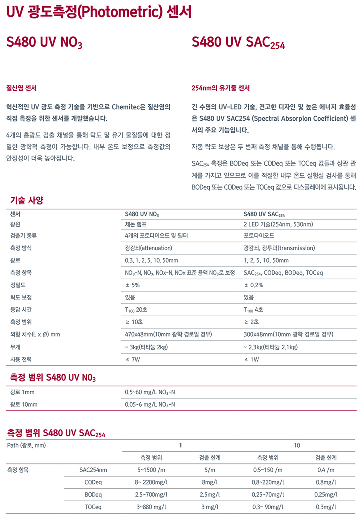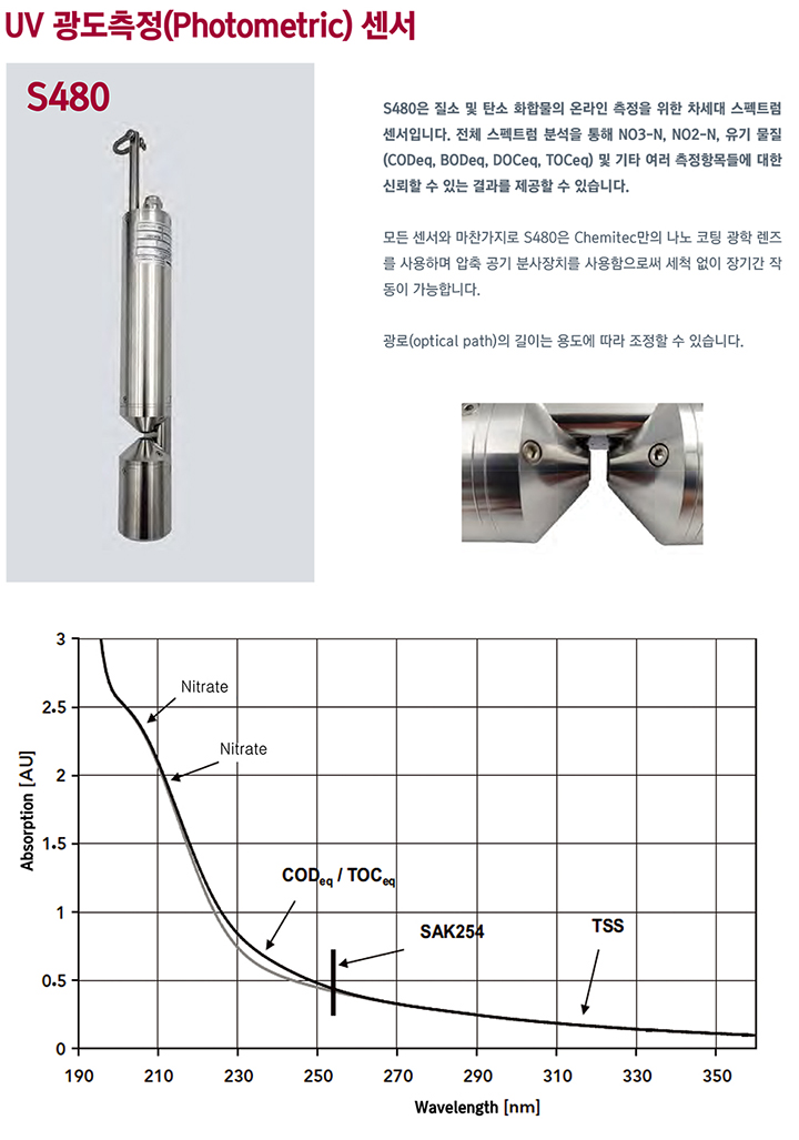 S480 UV SAC254´Â Çõ½ÅÀûÀÎ UV ±¤µµ ÃøÁ¤ ±â¼úÀ» ±â¹ÝÀ¸·Î Áú¼Ò ¹× ź¼Ò ÈÇÕ¹°ÀÇ ¿Â¶óÀÎ ÃøÁ¤À» À§ÇÑ Â÷¼¼´ë ½ºÆåÆ®·³ ¼¾¼ÀÔ´Ï´Ù. Àüü ½ºÆåÆ®·³ ºÐ¼®À» ÅëÇØ NO3-N, NO2-N, À¯±â ¹°Áú (CODeq, BODeq, DOCeq, TOCeq) ¹× ±âŸ ¿©·¯ ÃøÁ¤Ç׸ñµé¿¡ ´ëÇÑ ½Å·ÚÇÒ ¼ö ÀÖ´Â °á°ú¸¦ Á¦°øÇÒ ¼ö ÀÖ½À´Ï´Ù. ±ä ¼ö¸íÀÇ UV-LED ±â¼ú, °ß°íÇÑ µðÀÚÀÎ ¹× ³ôÀº ¿¡³ÊÁö È¿À²¼ºÀº S480 UV SAC254 (Spectral Absorpion Coefficient) ¼¾¼ÀÇ ÁÖ¿ä ±â´ÉÀÔ´Ï´Ù. ÀÚµ¿ ʵµ º¸»óÀº µÎ ¹øÂ° ÃøÁ¤ ä³ÎÀ» ÅëÇØ ¼öÇàµË´Ï´Ù. SAC254 ÃøÁ¤Àº BODeq ¶Ç´Â CODeq ¶Ç´Â TOCeq °ªµé°ú »ó°ü °ü°è¸¦ °¡Áö°í ÀÖÀ¸¹Ç·Î À̸¦ ÀûÀýÇÑ ³»ºÎ ¿Âµµ ½ÇÇè½Ç °Ë»ç¸¦ ÅëÇØ BODeq ¶Ç´Â CODeq ¶Ç´Â TOCeq °ªÀ¸·Î µð½ºÇ÷¹ÀÌ¿¡ Ç¥½ÃµË´Ï´Ù. ¸ðµç ¼¾¼¿Í ¸¶Âù°¡Áö·Î S480Àº Chemitec¸¸ÀÇ ³ª³ë ÄÚÆÃ ±¤ÇÐ ·»Á »ç¿ëÇÏ¸ç ¾ÐÃà °ø±â ºÐ»çÀåÄ¡¸¦ »ç¿ëÇÔÀ¸·Î½á ¼¼Ã´ ¾øÀÌ Àå±â°£ ÀÛµ¿ÀÌ °¡´ÉÇÕ´Ï´Ù. ![]() Á¦Ç° Ư¡ : 1) UV ½ºÆåÆ®·³ ºÐ¼®À» ÅëÇÑ BODeq ¶Ç´Â CODeq ¶Ç´Â TOCeq ÃøÁ¤ 2) ÀÚµ¿ ʵµ º¸»ó 3) ³»ºÎ ¿Âµµ º¸Á¤À¸·Î ÃøÁ¤°ªÀÇ ¾ÈÁ¤¼º º¸Àå 4) ³·Àº À¯Áöº¸¼ö (³ª³ëÄÚÆÃ, ¿¡¾î ºÐ»ç ¼¼Á¤) ÀÀ¿ë∙»ç¿ëºÐ¾ß : ¼öÁúȯ°æ ¸ð´ÏÅ͸µ, Á¤¼öÀå, ÇÏÆó¼ö ó¸®Àå, ¾ç¾îÀå |