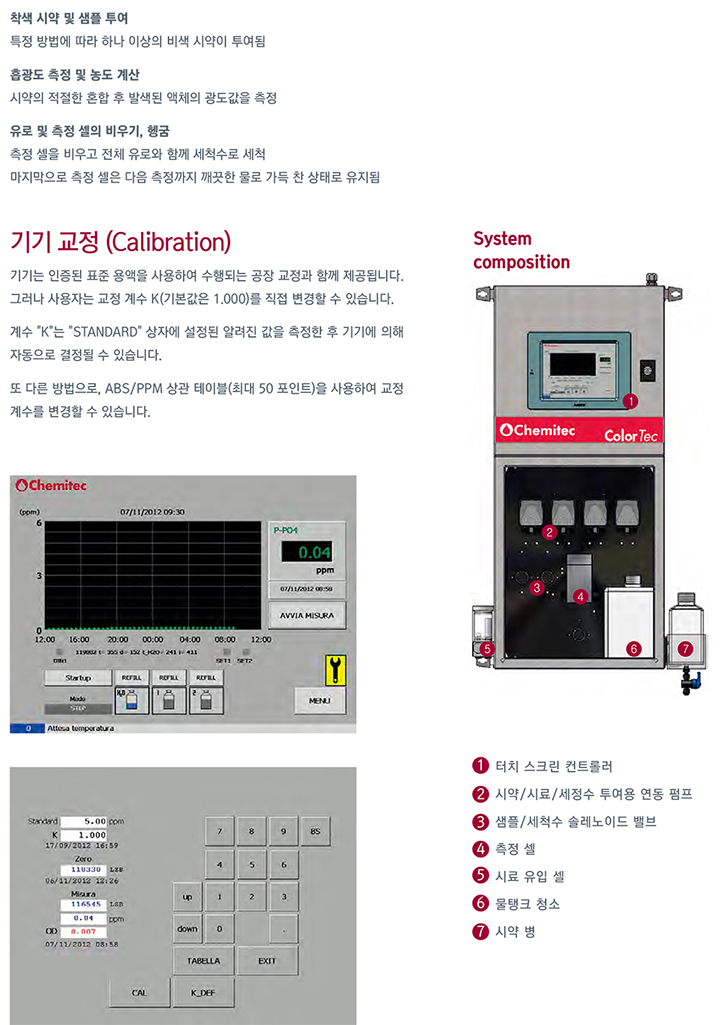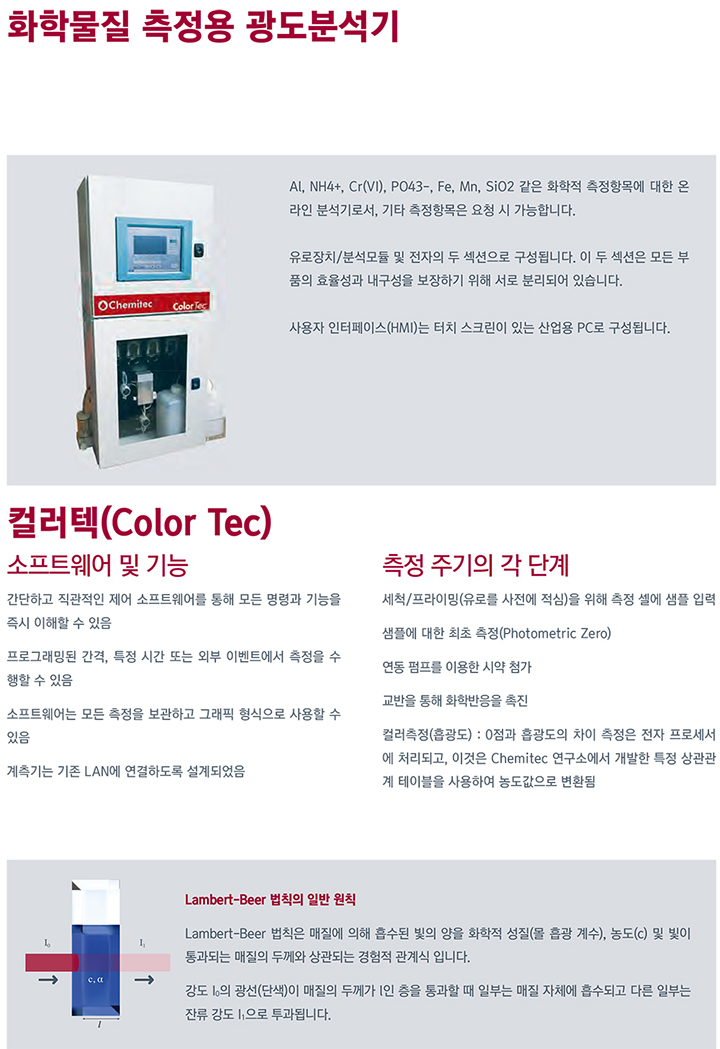 ¿Â¶óÀÎ Àλ꿰¡¤Áú»ê¿° ºÐ¼®±â, Color Tec Áß±Ý¼Ó ÃøÁ¤¿ë ±¤µµ(Photometric) ºÐ¼®±âÀÎ Color TecÀº ¹ß»ö½Ã¾àÀ» »ç¿ëÇÏ¿© NH4+,PO43- °°Àº ÈÇÐÀû ÃøÁ¤Ç׸ñ¿¡ ´ëÇÑ ¿Â¶óÀÎ ºÐ¼®±âÀÔ´Ï´Ù. ±âŸ ÃøÁ¤Ç׸ñÀº ¿äû½Ã °¡´ÉÇÕ´Ï´Ù. À¯·ÎÀåÄ¡/ºÐ¼®¸ðµâ ¹× ÀüÀÚÀÇ µÎ ¼½¼ÇÀ¸·Î ±¸¼ºµË´Ï´Ù. ÀÌ µÎ ¼½¼ÇÀº ¸ðµç ºÎǰÀÇ È¿À²¼º°ú ³»±¸¼ºÀ» º¸ÀåÇϱâ À§ÇØ ¼·Î ºÐ¸®µÇ¾î ÀÖ½À´Ï´Ù. »ç¿ëÀÚ ÀÎÅÍÆäÀ̽º(HMI)´Â ÅÍÄ¡ ½ºÅ©¸°ÀÌ ÀÖ´Â »ê¾÷¿ë PC·Î ±¸¼ºµË´Ï´Ù. ÃøÁ¤ ÁÖ±âÀÇ °¢ ´Ü°è ¼¼Ã´/ÇÁ¶óÀ̹Ö(À¯·Î¸¦ »çÀü¿¡ Àû½É)À» À§ÇØ ÃøÁ¤ ¼¿¿¡ »ùÇà ÀÔ·Â »ùÇÿ¡ ´ëÇÑ ÃÖÃÊ ÃøÁ¤(Photometric Zero) ¿¬µ¿ ÆßÇÁ¸¦ ÀÌ¿ëÇÑ ½Ã¾à ÷°¡ ±³¹ÝÀ» ÅëÇØ ÈÇйÝÀÀÀ» ÃËÁø. Ä÷¯ÃøÁ¤(Èí±¤µµ) : 0Á¡°ú Èí±¤µµÀÇ Â÷ÀÌ ÃøÁ¤Àº ÀüÀÚ ÇÁ·Î¼¼¼¿¡¼ 󸮵ǰí, À̰ÍÀº Chemitec ¿¬±¸¼Ò¿¡¼ °³¹ßÇÑ Æ¯Á¤ »ó°ü°ü°è Å×À̺íÀ» »ç¿ëÇÏ¿© ³óµµ°ªÀ¸·Î º¯È¯µÊ 1) Âø»ö ½Ã¾à ¹× »ùÇà Åõ¿© ƯÁ¤ ¹æ¹ý¿¡ µû¶ó Çϳª ÀÌ»óÀÇ ºñ»ö ½Ã¾àÀÌ Åõ¿©µÊ 2) Èí±¤µµ ÃøÁ¤ ¹× ³óµµ °è»ê ½Ã¾àÀÇ ÀûÀýÇÑ È¥ÇÕ ÈÄ ¹ß»öµÈ ¾×üÀÇ ±¤µµ°ªÀ» ÃøÁ¤ 3) À¯·Î ¹× ÃøÁ¤ ¼¿ÀÇ ºñ¿ì±â, Çó±À ÃøÁ¤ ¼¿À» ºñ¿ì°í Àüü À¯·Î¿Í ÇÔ²² ¼¼Ã´¼ö·Î ¼¼Ã´ 4) ¸¶Áö¸·À¸·Î ÃøÁ¤ ¼¿Àº ´ÙÀ½ ÃøÁ¤±îÁö ±ú²ýÇÑ ¹°·Î °¡µæ Âù »óÅ·ΠÀ¯ÁöµÊ ±â±â ±³Á¤ (Calibration) ±â±â´Â ÀÎÁõµÈ Ç¥ÁØ ¿ë¾×À» »ç¿ëÇÏ¿© ¼öÇàµÇ´Â °øÀå ±³Á¤°ú ÇÔ²² Á¦°øµË´Ï´Ù. ±×·¯³ª »ç¿ëÀÚ´Â ±³Á¤ °è¼ö K(±âº»°ªÀº 1.000)¸¦ Á÷Á¢ º¯°æÇÒ ¼ö ÀÖ½À´Ï´Ù. °è¼ö "K"´Â "STANDARD" »óÀÚ¿¡ ¼³Á¤µÈ ¾Ë·ÁÁø °ªÀ» ÃøÁ¤ÇÑ ÈÄ ±â±â¿¡ ÀÇÇØ ÀÚµ¿À¸·Î °áÁ¤µÉ ¼ö ÀÖ½À´Ï´Ù. ¶Ç ´Ù¸¥ ¹æ¹ýÀ¸·Î, ABS/PPM »ó°ü Å×À̺í(ÃÖ´ë 50 Æ÷ÀÎÆ®)À» »ç¿ëÇÏ¿© ±³Á¤°è¼ö¸¦ º¯°æÇÒ ¼ö ÀÖ½À´Ï´Ù. Lambert-Beer ¹ýÄ¢ÀÇ ÀÏ¹Ý ¿øÄ¢ Lambert-Beer ¹ýÄ¢Àº ¸ÅÁú¿¡ ÀÇÇØ Èí¼öµÈ ºûÀÇ ¾çÀ» ÈÇÐÀû ¼ºÁú(¸ô Èí±¤ °è¼ö), ³óµµ(c) ¹× ºûÀÌ Åë°úµÇ´Â ¸ÅÁúÀÇ µÎ²²¿Í »ó°üµÇ´Â °æÇèÀû °ü°è½Ä ÀÔ´Ï´Ù. °µµ I0ÀÇ ±¤¼±(´Ü»ö)ÀÌ ¸ÅÁúÀÇ µÎ²²°¡ lÀÎ ÃþÀ» Åë°úÇÒ ¶§ ÀϺδ ¸ÅÁú ÀÚü¿¡ Èí¼öµÇ°í ´Ù¸¥ ÀϺδ ÀÜ·ù °µµ I1À¸·Î Åõ°úµË´Ï´Ù. ÇÁ·Î¼¼¼ ºÐ¼®±â ÃøÁ¤ ¼¿ ÃøÁ¤ ¼¿Àº ³»ºÎ¿¡ ºÐ¼®ÇÒ ¾×ü°¡ È帣´Â ½ÃÇè°üÀ» Æ÷ÇÔÇÏ´Â ¿Âµµ Á¶ÀýµÈ ¾Ë·ç¹Ì´½ ÄÚÀÏ·Î ±¸¼ºµË´Ï´Ù. Lambert-Beer ¹ýÄ¢¿¡ µû¶ó LED°¡ ÀÖ´Â ÇÁ·ÎÁ§ÅÍ´Â ¸Åü¸¦ Åë°úÇÏ´Â ±¤¼±À» º¸³»°í ºÐ¼®ÇÒ ¾×ü¿¡ ´ëÇØ ÇÁ·ÎÁ§ÅÍÀÇ ¹Ý´ëÂÊ¿¡ À§Ä¡ÇÑ Æ÷Åä´ÙÀÌ¿Àµå´Â ¹æÃâµÈ ±¤¼±¿¡ ÀÇÇØ ÁÖ¾îÁø ½ÅÈ£¸¦ ¼ö½ÅÇÕ´Ï´Ù ÇÊÅ͸µ ½Ã½ºÅÛ(¼±Åà »çÇ×) ƯÁ¤ ÀÀ¿ë ºÐ¾ß¿¡¼´Â ºÐ¼®ÇÒ ¾×ü¿¡ Á¸ÀçÇÏ´Â ºÎÀ¯ ÀÔÀÚ¸¦ Á¦°ÅÇϱâ À§ÇØ ½Ã·áÀÇ Àü󸮸¦ ¼öÇàÇØ¾ß ÇÕ´Ï´Ù. ChemitecÀº 100¥ìmÀÇ ¿©°ú ½Ã½ºÅÛÀ» Á¦°øÇÒ ¼ö ÀÖÀ¸¸ç, º®¿¡ Æí¾ÈÇÏ°Ô ¼³Ä¡ÇÒ ¼ö ÀÖµµ·Ï ¹Ì¸® õ°øµÈ ÆÐ³Î¿¡ ÀÚü û¼Ò ½Ã½ºÅÛ(¾ÐÃà °ø±â Æ÷ÇÔ)ÀÌ ÀåÂøµÇ¾î ÀÖ½À´Ï´Ù. Á¦Ç° Ư¡ : 1) °£´ÜÇϰí Á÷°üÀûÀÎ Á¦¾î ¼ÒÇÁÆ®¿þ¾î¸¦ ÅëÇØ ¸ðµç ¸í·É°ú ±â´ÉÀ» Áï½Ã ÀÌÇØÇÒ ¼ö ÀÖÀ½ 2) ÇÁ·Î±×·¡¹ÖµÈ °£°Ý, ƯÁ¤ ½Ã°£ ¶Ç´Â ¿ÜºÎ À̺¥Æ®¿¡¼ ÃøÁ¤À» ¼öÇàÇÒ ¼ö ÀÖÀ½ 3) ¼ÒÇÁÆ®¿þ¾î´Â ¸ðµç ÃøÁ¤À» º¸°üÇÏ°í ±×·¡ÇÈ Çü½ÄÀ¸·Î »ç¿ëÇÒ ¼ö ÀÖÀ½ 4) °èÃø±â´Â ±âÁ¸ LAN¿¡ ¿¬°áÇϵµ·Ï ¼³°èµÇ¾úÀ½