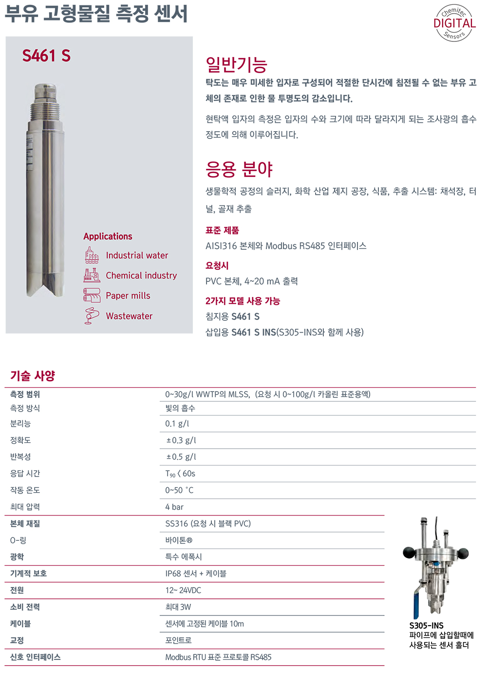 ºÎÀ¯°íÇü¹°(MLSS) ¼¾¼, S461 S ʵµ´Â ¸Å¿ì ¹Ì¼¼ÇÑ ÀÔÀÚ·Î ±¸¼ºµÇ¾î ÀûÀýÇÑ ´Ü½Ã°£¿¡ ħÀüµÉ ¼ö ¾ø´Â ºÎÀ¯ °íüÀÇ Á¸Àç·Î ÀÎÇÑ ¹° Åõ¸íµµÀÇ °¨¼ÒÀÔ´Ï´Ù. Çöʾ×(Suspended Solid) ÀÔÀÚÀÇ ÃøÁ¤Àº ÀÔÀÚÀÇ ¼ö¿Í Å©±â¿¡ µû¶ó ´Þ¶óÁö°Ô µÇ´Â Á¶»ç±¤ÀÇ Èí¼ö Á¤µµ¿¡ ÀÇÇØ ÀÌ·ç¾îÁý´Ï´Ù. S461 S ºÎÀ¯°íÇü¹Ä ¼¾¼´Â ÀÌ·¯ÇÑ Èí±¤ ¹æ½ÄÀ¸·Î ÃøÁ¤µÇ¸ç, 0~30g/LÀÇ MLSS¸¦ ÃøÁ¤ÇÒ ¼ö ÀÖ½À´Ï´Ù. Á¦Ç° Ư¡ : 1) Èí±¤ ¹æ½Ä¿¡ ÀÇÇÑ MLSS Àü¿ë ¼¾¼ 2) AISI 316 ÀçÁúÀÇ º»Ã¼·Î µÇ¾î ÀÖ¾î ³»±¸¼ºÀÌ ¿ì¼öÇÔ 3) µðÁöÅÐ Ãâ·Â ¿äû½Ã 4~20mA ¾Æ³¯·Î±× Ãâ·Â °¡´É 4) 50½Ã¸®Áî¿¡¼ ÀÌ»óÀûÀ¸·Î Á¦¾î ¹× ȸéÇ¥½Ã °¡´É ÀÎÅÍÆäÀ̽º : Modbus RTU Ç¥ÁØ ÇÁ·ÎÅäÄÝ RS485 5) 2°¡Áö ¸ðµ¨ »ç¿ë °¡´É ħÁö¿ë S461 S »ðÀÔ¿ë S461 S INS(S305-INS¿Í ÇÔ²² »ç¿ë) ÀÀ¿ë∙»ç¿ëºÐ¾ß : ÇÏÆó¼ö ó¸®Àå »ý¹°ÇÐÀû °øÁ¤ÀÇ ½½·¯Áö, ÈÇÐ »ê¾÷ Á¦Áö °øÀå, ½Äǰ, ÃßÃ⠽ýºÅÛ: ä¼®Àå, ÅͳÎ, °ñÀç ÃßÃâ |