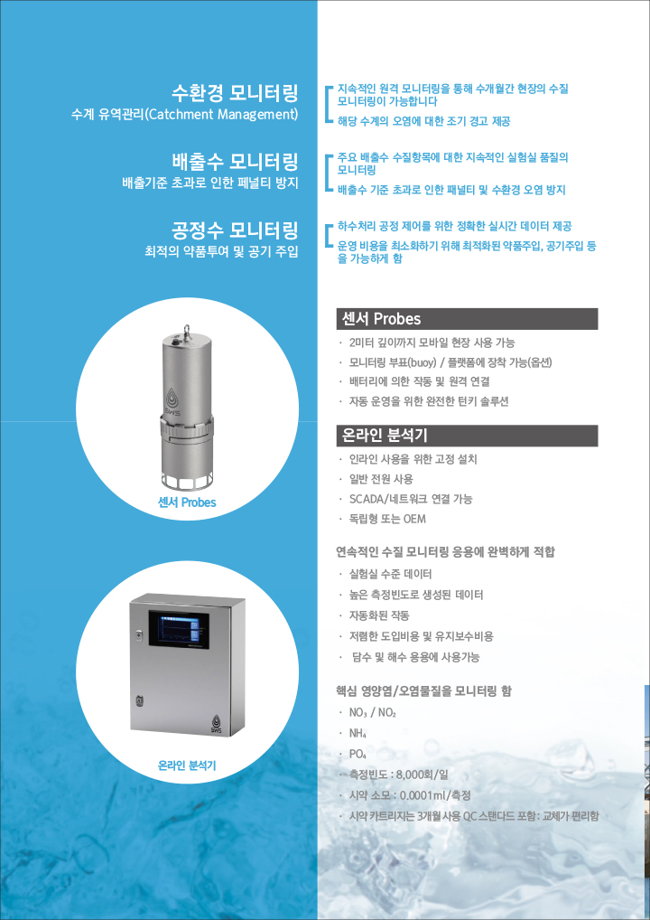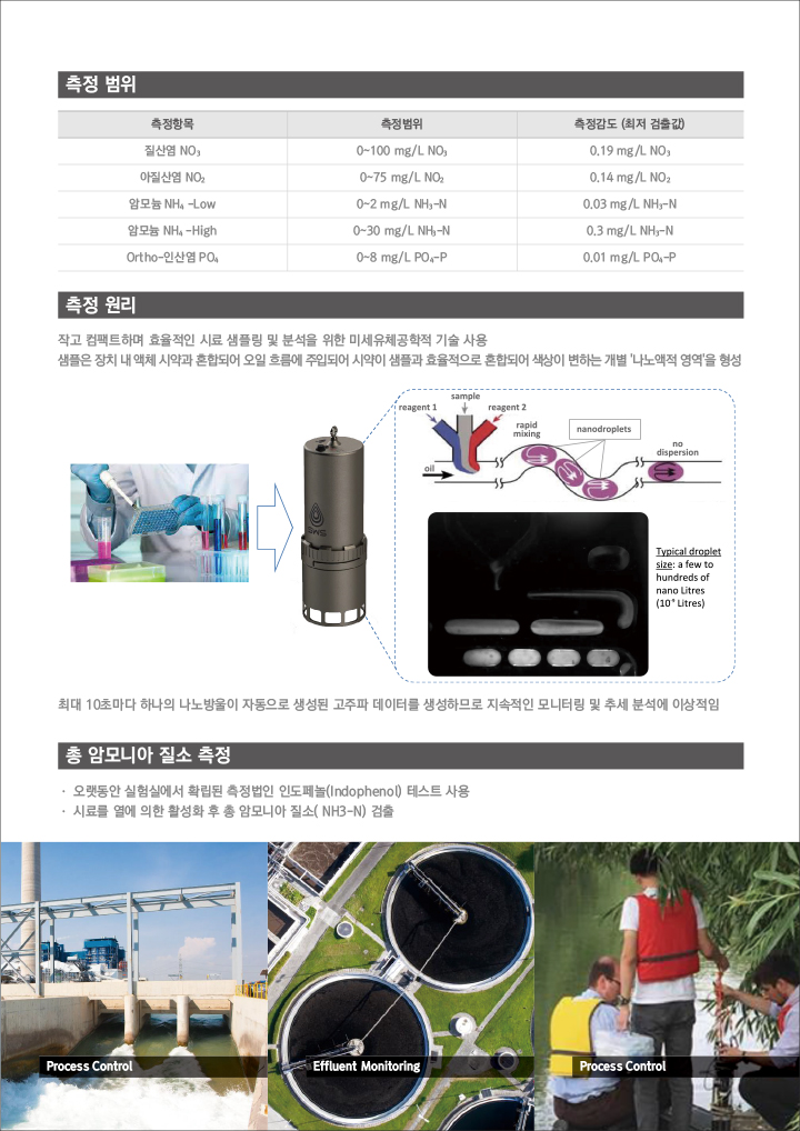 DropletSensTMÀº ÃÖ½ÅÀÇ ¹Ì¼¼À¯Ã¼°øÇÐÀû ±â¼ú(Microfluidics)À» »ç¿ëÇÑ ¼öÁú¼¾¼ ±â¹Ý Á¦Ç°À¸·Î µ¥ÀÌÅÍ ±â¹ÝÀÇ ÀÇ»ç°áÁ¤À» À§ÇØ ½ÇÇè½ÇÀ» ÇöÀåÀ¸·Î °¡Á®¿Â Çõ½ÅÀûÀÎ Á¦Ç°ÀÔ´Ï´Ù. Á¦Ç°Æ¯Â¡ ¼¾¼Probes ¡¤ 2¹ÌÅÍ ±íÀ̱îÁö ¸ð¹ÙÀÏ ÇöÀå »ç¿ë °¡´É ¡¤ ¸ð´ÏÅ͸µ ºÎÇ¥(buoy) / Ç÷§Æû¿¡ ÀåÂø °¡´É(¿É¼Ç) ¡¤ ¹èÅ͸®¿¡ ÀÇÇÑ ÀÛµ¿ ¹× ¿ø°Ý ¿¬°á ¡¤ ÀÚµ¿ ¿î¿µÀ» À§ÇÑ ¿ÏÀüÇÑ ÅÏŰ ¼Ö·ç¼Ç ¿Â¶óÀκм®±â ¡¤ ÀζóÀÎ »ç¿ëÀ» À§ÇÑ °íÁ¤ ¼³Ä¡ ¡¤ ÀÏ¹Ý Àü¿ø »ç¿ë ¡¤ SCADA / ³×Æ®¿öÅ© ¿¬°á °¡´É ¡¤ µ¶¸³Çü ¶Ç´Â OEM ¿¬¼ÓÀûÀÎ ¼öÁú ¸ð´ÏÅ͸µ ÀÀ¿ë¿¡ ¿Ïº®ÇÏ°Ô ÀûÇÕ ¡¤ ½ÇÇè½Ç ¼öÁØ µ¥ÀÌÅÍ ¡¤ ³ôÀº ÃøÁ¤ºóµµ·Î »ý¼ºµÈ µ¥ÀÌÅÍ ¡¤ ÀÚµ¿ÈµÈ ÀÛµ¿ ¡¤ Àú·ÅÇÑ µµÀÔºñ¿ë ¹× À¯Áöº¸¼ö ºñ¿ë ¡¤ ´ã¼ö ¹× ÇØ¼ö ÀÀ¿ë¿¡ »ç¿ë °¡´É ÇÙ½É ¿µ¾ç¿°/¿À¿°¹°ÁúÀ» ¸ð´ÏÅ͸µ ÇÔ ¡¤ NO3 / NO2 ¡¤ NH4 ¡¤ PO4 ¡¤ ÃøÁ¤ºóµµ : 8,000ȸ/ÀÏ ¡¤ ½Ã¾à ¼Ò¸ð : 0.0001ml/ÃøÁ¤ ¡¤ ½Ã¾à īƮ¸®Áö´Â 3°³¿ù »ç¿ë QC ½ºÅÄ´Ùµå Æ÷ÇÔ : ±³Ã¼°¡ Æí¸®ÇÔ |