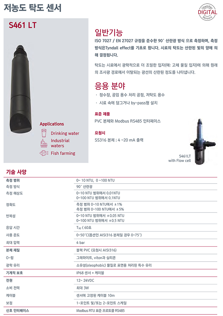 S461 LT Àú³óµµ ʵµ(Turbidity) ¼¾¼´Â 0~10 NTU ¶Ç´Â 0~100 NTU ÃøÁ¤ÀÌ °¡´ÉÇϸç, ISO 7027 / EN 27027 ±ÔÁ¤¿¡ µû¸¥ 90¡Æ »ê¶õ±¤ ¹æ½ÄÀ¸·Î ÃøÁ¤Çϸç, ÃøÁ¤ ¹æ½ÄÀºTyndall effect¸¦ ±âÃÊ·Î ÇÕ´Ï´Ù. ½Ã·áÀÇ Å¹µµ´Â »ê¶õµÈ ºûÀÇ ¾ç¿¡ ÀÇÇØ °áÁ¤µË´Ï´Ù. ʵµ´Â ½Ã·á¿¡¼ ±¤ÇÐÀûÀ¸·Î ´õ Á¶¹ÐÇÑ ÀÔÀÚ(¿¹: °íü ¹°Áú ÀÔÀÚ)¿¡ ÀÇÇØ ¿ø·¡ÀÇ Á¶»ç±¤ °æ·Î¿¡¼ ÀÌÅ»µÇ´Â ±¤¼±ÀÇ »ê¶õµÈ Á¤µµ¸¦ ³ªÅ¸³À´Ï´Ù. Á¦Ç° Ư¡ : 1) Àú³óµµ ʵµ ÃøÁ¤ (0~10 NTU ¶Ç´Â 0~100 NTU) 2) µðÁöÅÐ Ãâ·Â ¿äû½Ã 4~20mA ¾Æ³¯·Î±× Ãâ·Â °¡´É 3) ISO 7027 / EN 27027 ±ÔÁ¤¿¡ µû¸¥ 90¡Æ »ê¶õ±¤ ¹æ½ÄÀ¸·Î ÃøÁ¤ 4) ͏®ºê·¹À̼ÇÀÌ ¿ëÀÌÇÔ 5) 50½Ã¸®Áî¿¡¼ ÀÌ»óÀûÀ¸·Î Á¦¾î ¹× ȸéÇ¥½Ã °¡´É ÀÎÅÍÆäÀ̽º : Modbus RTU Ç¥ÁØ ÇÁ·ÎÅäÄÝ RS485 6) ¿ÜÇü ÀçÁú : PVC ¿äû½Ã SS316 ÀçÁú °¡´É ÀÀ¿ë∙»ç¿ëºÐ¾ß : ¡¤ Á¤¼öÀå, °ø¾÷¿ë¼ö, Áß¼ö ó¸® °øÁ¤, ¾ç¾îÀå ¼ö, Àúʵµ ¿ë¼ö ¡¤ ½Ã·á ¼Ó¿¡ ´ã±×°Å³ª by-passÇü ¼³Ä¡ °¡´É |