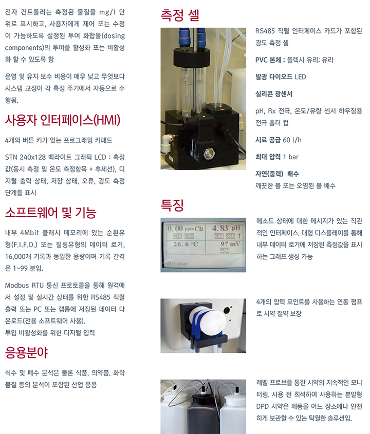 Á¦Ç°Æ¯Â¡ 1) ¸Þ¼Òµå »óÅ¿¡ ´ëÇÑ ¸Þ½ÃÁö°¡ ÀÖ´Â Á÷°üÀûÀÎ ÀÎÅÍÆäÀ̽º. ´ëÇü µð½ºÇ÷¹À̸¦ ÅëÇØ ³»ºÎ µ¥ÀÌÅÍ ·Î°Å¿¡ ÀúÀåµÈ ÃøÁ¤°ªÀ» Ç¥½ÃÇÏ´Â ±×·¡ÇÁ »ý¼º °¡´É. 2) 4°³ÀÇ ¾Ð·Â Æ÷ÀÎÆ®¸¦ »ç¿ëÇÏ´Â ¿¬µ¿ ÆßÇÁ·Î ½Ã¾à Àý¾à º¸Àå 3) ·¹º§ ÇÁ·Îºê¸¦ ÅëÇÑ ½Ã¾àÀÇ Áö¼ÓÀûÀÎ ¸ð´ÏÅ͸µ. »ç¿ë Àü Èñ¼®ÇÏ¿© »ç¿ëÇÏ´Â ºÐ¸»Çü DPD ½Ã¾àÀº Á¦Ç°À» ¾î´À Àå¼Ò¿¡³ª ¾ÈÀüÇÏ°Ô º¸°üÇÒ ¼ö Àִ Ź¿ùÇÑ ¼Ö·ç¼ÇÀÓ. 4) ÀüÀÚ ÄÁÆ®·Ñ·¯´Â ÃøÁ¤µÈ ¹°ÁúÀ» mg/l ´ÜÀ§·Î Ç¥½ÃÇϰí, »ç¿ëÀÚ¿¡°Ô Á¦¾î ¶Ç´Â ¼öÁ¤ÀÌ °¡´ÉÇϵµ·Ï ¼³Á¤µÈ Åõ¿© ÈÇÕ¹°(dosing components)ÀÇ Åõ¿©¸¦ Ȱ¼ºÈ ¶Ç´Â ºñȰ¼ºÈ ÇÒ ¼ö ÀÖµµ·Ï ÇÔ. 5) ¿î¿µ ¹× À¯Áö º¸¼ö ºñ¿ëÀÌ ¸Å¿ì ³·°í ¹«¾ùº¸´Ù ½Ã½ºÅÛ ±³Á¤ÀÌ °¢ ÃøÁ¤ Áֱ⿡¼ ÀÚµ¿À¸·Î ¼öÇàµÊ. 6) ¿Â¶óÀÎ ÃøÁ¤±âÀÇ À¯·Î ¼¿ÀÇ Æ¯Â¡ - RS485 Á÷·Ä ÀÎÅÍÆäÀ̽º Ä«µå°¡ Æ÷ÇÔµÈ ±¤µµ ÃøÁ¤ ¼¿ - PVC º»Ã¼ ; Ç÷º½Ã À¯¸®; À¯¸® - ¹ß±¤ ´ÙÀÌ¿Àµå LED - ½Ç¸®ÄÜ ±¤¼¾¼ - pH, Rx Àü±Ø, ¿Âµµ/À¯·® ¼¾¼ ÇϿ졿ë Àü±Ø Ȧ´õ ÄÅ - ½Ã·á °ø±Þ 60 l/h - ÃÖ´ë ¾Ð·Â 1 bar - ÀÚ¿¬(Áß·Â) ¹è¼ö - ±ú²ýÇÑ ¹° ¶Ç´Â ¿À¿°µÈ ¹° ¹è¼ö ÀÀ¿ëºÐ¾ß ½Ä¼ö ¹× Æó¼ö ºÐ¼®Àº ¹°·Ð ½Äǰ, ÀǾàǰ, ÈÇÐ ¹°Áú µîÀÇ ºÐ¼®ÀÌ Æ÷ÇÔµÈ »ê¾÷ ÀÀ¿ë |