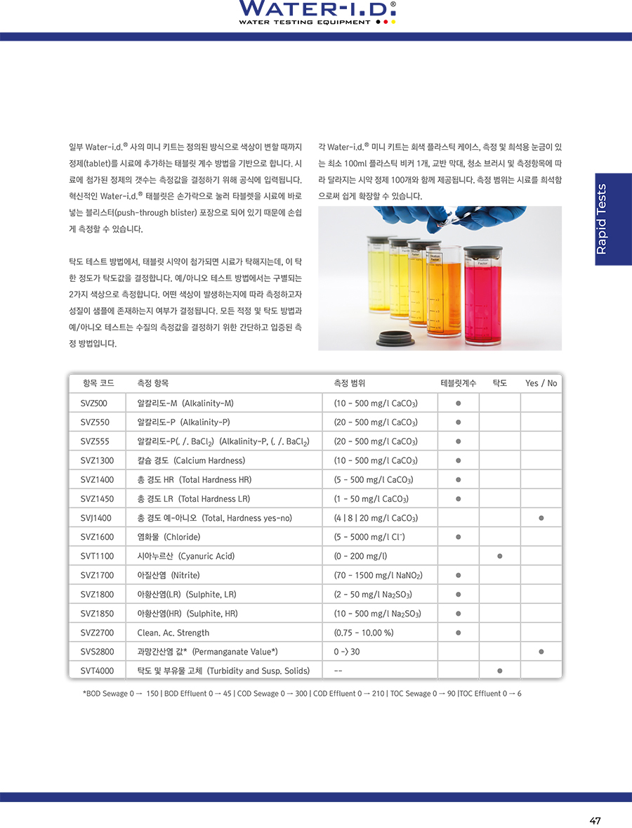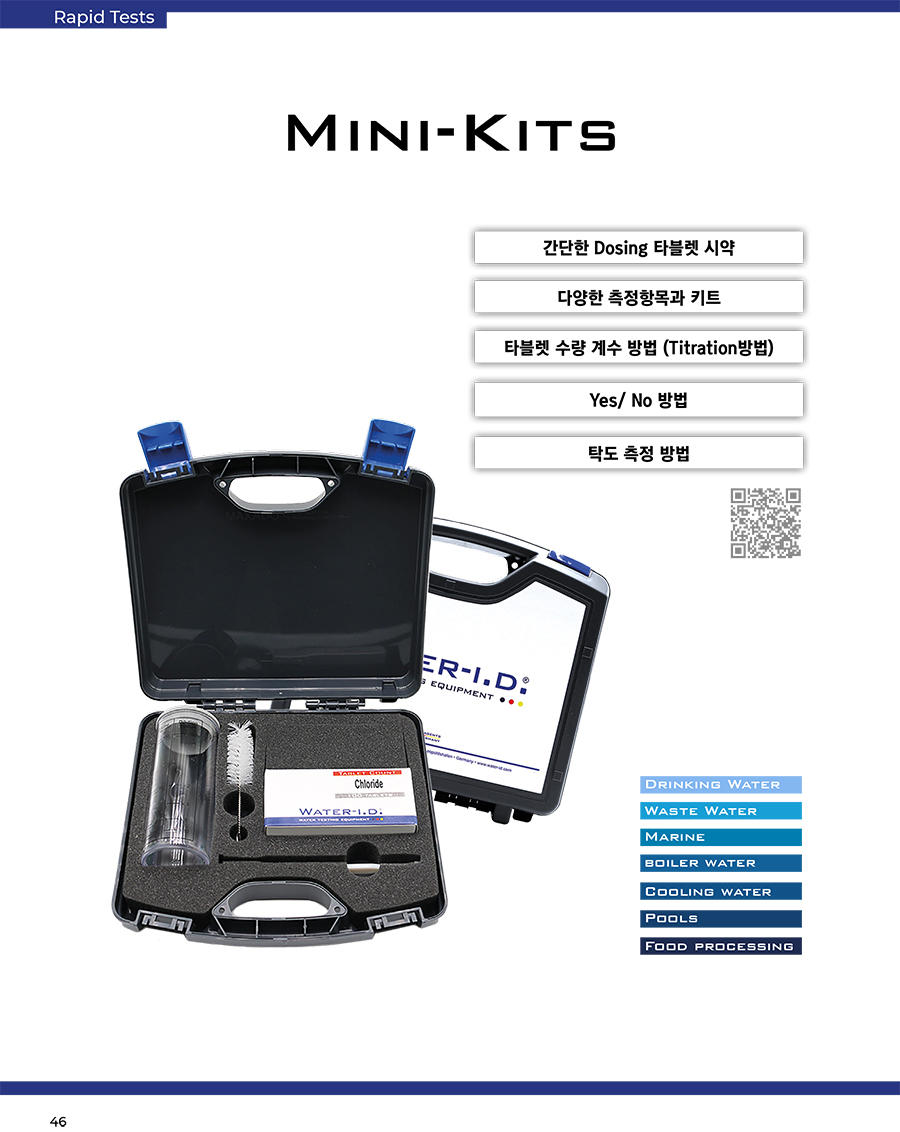 ÀϺΠWater-i.d. ¢ç »çÀÇ ¹Ì´Ï ŰƮ´Â Á¤ÀÇµÈ ¹æ½ÄÀ¸·Î »ö»óÀÌ º¯ÇÒ ¶§±îÁö Á¤Á¦(tablet)¸¦ ½Ã·á¿¡ Ãß°¡ÇÏ´Â ÅÂºí¸´ °è¼ö ¹æ¹ýÀ» ±â¹ÝÀ¸·Î ÇÕ´Ï´Ù. ½Ã·á¿¡ ÷°¡µÈ Á¤Á¦ÀÇ °¹¼ö´Â ÃøÁ¤°ªÀ» °áÁ¤Çϱâ À§ÇØ °ø½Ä¿¡ ÀԷµ˴ϴÙ. Çõ½ÅÀûÀÎ Water-i.d. ¢ç ÅÂºí¸´Àº ¼Õ°¡¶ôÀ¸·Î ´·¯ Ÿºí·¿À» ½Ã·á¿¡ ¹Ù·Î ³Ö´Â ºí¸®½ºÅÍ(push-through blister) Æ÷ÀåÀ¸·Î µÇ¾î Àֱ⠶§¹®¿¡ ¼Õ½±°Ô ÃøÁ¤ÇÒ ¼ö ÀÖ½À´Ï´Ù. ʵµ Å×½ºÆ® ¹æ¹ý¿¡¼, ÅÂºí¸´ ½Ã¾àÀÌ Ã·°¡µÇ¸é ½Ã·á°¡ Å¹ÇØÁö´Âµ¥, ÀÌ Å¹ÇÑ Á¤µµ°¡ ʵµ°ªÀ» °áÁ¤ÇÕ´Ï´Ù. ¿¹/¾Æ´Ï¿À Å×½ºÆ® ¹æ¹ý¿¡¼´Â ±¸º°µÇ´Â 2°¡Áö »ö»óÀ¸·Î ÃøÁ¤ÇÕ´Ï´Ù. ¾î¶² »ö»óÀÌ ¹ß»ýÇÏ´ÂÁö¿¡ µû¶ó ÃøÁ¤ÇϰíÀÚ ¼ºÁúÀÌ »ùÇÿ¡ Á¸ÀçÇÏ´ÂÁö ¿©ºÎ°¡ °áÁ¤µË´Ï´Ù. ¸ðµç ÀûÁ¤ ¹× ʵµ ¹æ¹ý°ú ¿¹/¾Æ´Ï¿À Å×½ºÆ®´Â ¼öÁúÀÇ ÃøÁ¤°ªÀ» °áÁ¤Çϱâ À§ÇÑ °£´ÜÇϰí ÀÔÁõµÈ ÃøÁ¤ ¹æ¹ýÀÔ´Ï´Ù. °¢ Water-i.d. ¢ç ¹Ì´Ï ŰƮ´Â ȸ»ö ÇÃ¶ó½ºÆ½ ÄÉÀ̽º, ÃøÁ¤ ¹× Èñ¼®¿ë ´«±ÝÀÌ ÀÖ´Â ÃÖ¼Ò 100ml ÇÃ¶ó½ºÆ½ ºñÄ¿ 1°³, ±³¹Ý ¸·´ë, û¼Ò ºê·¯½Ã ¹× ÃøÁ¤Ç׸ñ¿¡ µû¶ó ´Þ¶óÁö´Â ½Ã¾à Á¤Á¦ 100°³¿Í ÇÔ²² Á¦°øµË´Ï´Ù. ÃøÁ¤ ¹üÀ§´Â ½Ã·á¸¦ Èñ¼®ÇÔ À¸·Î½á ½±°Ô È®ÀåÇÒ ¼ö ÀÖ½À´Ï´Ù. |