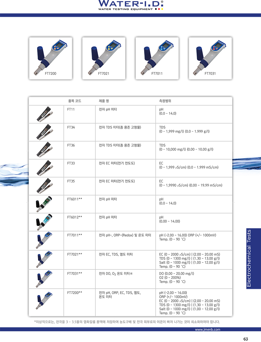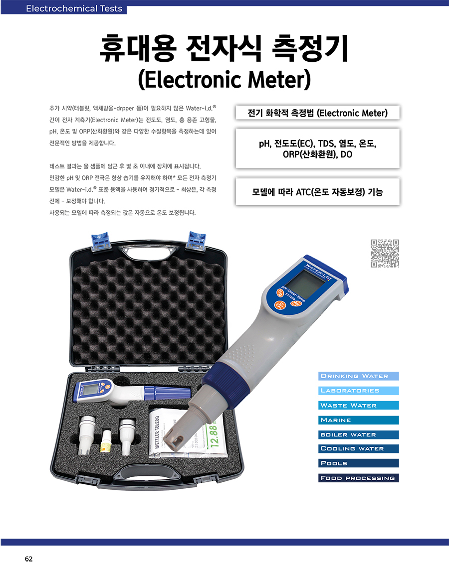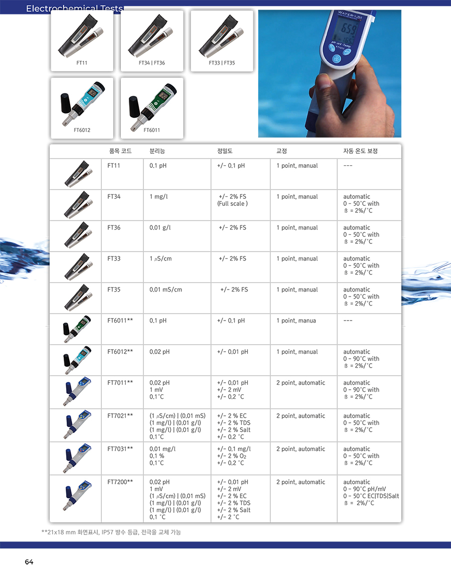 Electronic Meter (ÈÞ´ë¿ë ÀüÀÚ½Ä ÃøÁ¤±â) Ãß°¡ ½Ã¾à(ÅÂºí¸´, ¾×ü¹æ¿ï-drpper µî)ÀÌ ÇÊ¿äÇÏÁö ¾ÊÀº Water-i.d. ¢ç °£ÀÌ ÀüÀÚ °èÃø±â(Electronic Meter)´Â Àüµµµµ, ¿°µµ, ÃÑ ¿ëÁ¸ °íÇü¹°, pH, ¿Âµµ ¹× ORP(»êÈȯ¿ø)¿Í °°Àº ´Ù¾çÇÑ ¼öÁúÇ׸ñÀ» ÃøÁ¤Çϴµ¥ ÀÖ¾î Àü¹®ÀûÀÎ ¹æ¹ýÀ» Á¦°øÇÕ´Ï´Ù. Å×½ºÆ® °á°ú´Â ¹° »ùÇÿ¡ ´ã±Ù ÈÄ ¸î ÃÊ À̳»¿¡ ÀåÄ¡¿¡ Ç¥½ÃµË´Ï´Ù. ¹Î°¨ÇÑ pH ¹× ORP Àü±ØÀº Ç×»ó ½À±â¸¦ À¯ÁöÇØ¾ß Çϸç* ¸ðµç ÀüÀÚ ÃøÁ¤±â ¸ðµ¨Àº Water-i.d ¢ç Ç¥ÁØ ¿ë¾×À» »ç¿ëÇÏ¿© Á¤±âÀûÀ¸·Î - ÃÖ»óÀº, °¢ ÃøÁ¤ Àü¿¡ - º¸Á¤ÇØ¾ß ÇÕ´Ï´Ù. »ç¿ëµÇ´Â ¸ðµ¨¿¡ µû¶ó ÃøÁ¤µÇ´Â °ªÀº ÀÚµ¿À¸·Î ¿Âµµ º¸Á¤µË´Ï´Ù. |