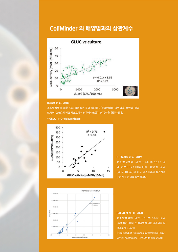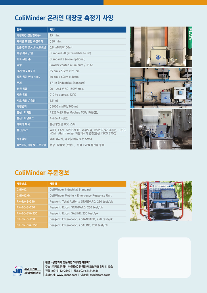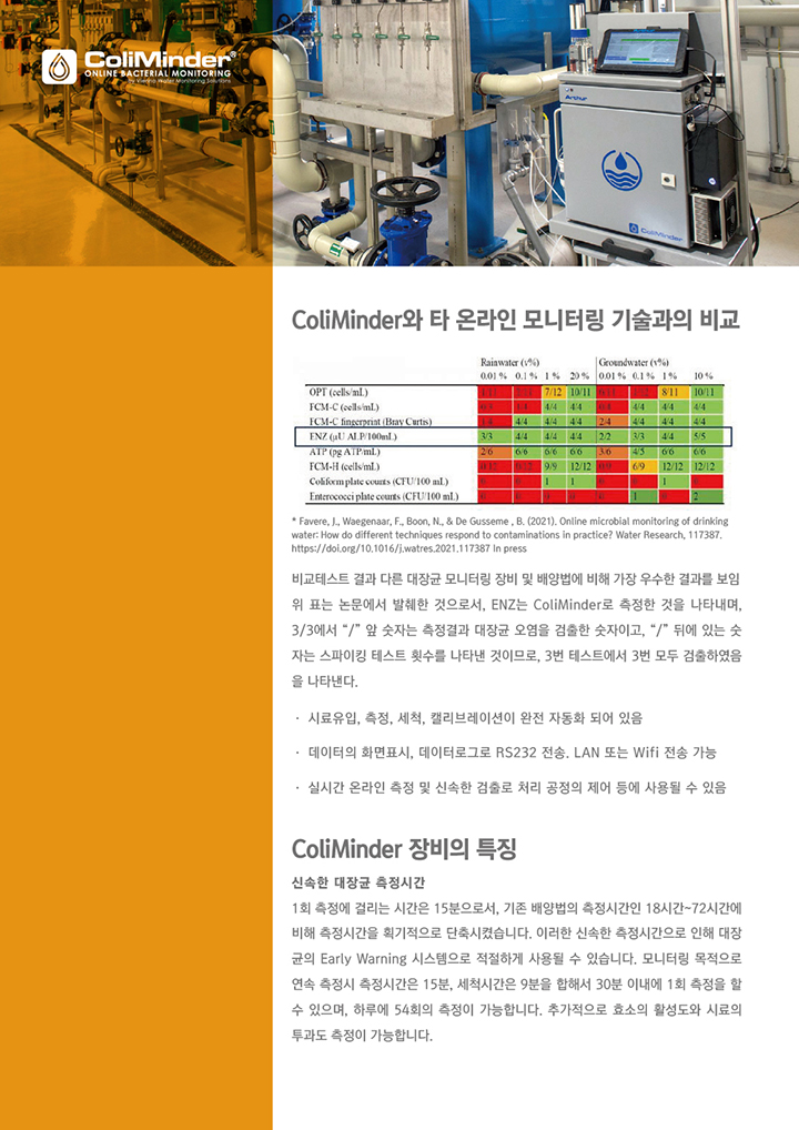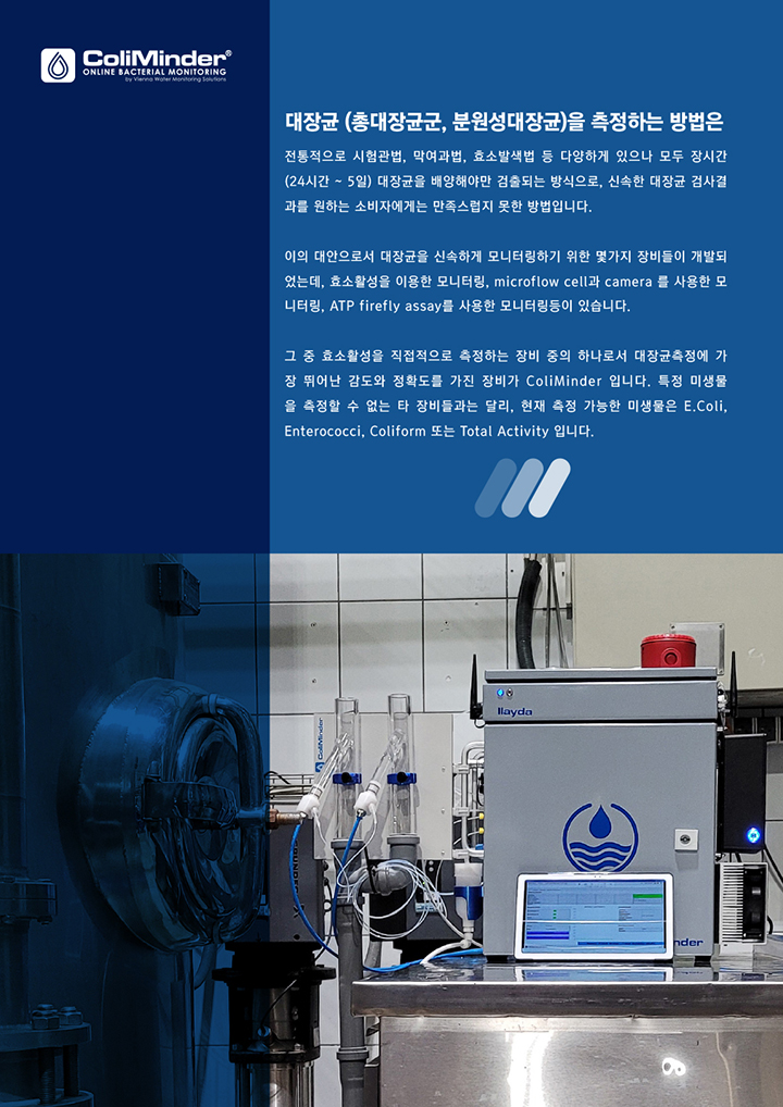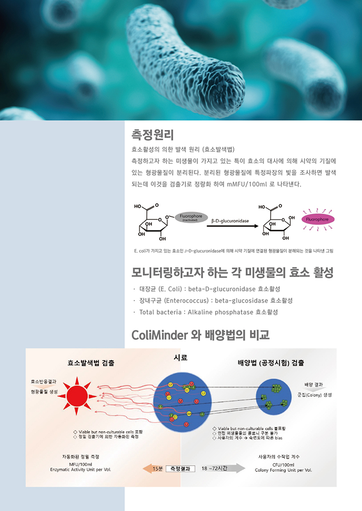 Á¦Ç°¼³¸í : ´ëÀå±ÕÀÌ °¡Áø °íÀ¯ÀÇ È¿¼Ò Ȱ¼ºÀ» Á÷Á¢ÀûÀ¸·Î ÃøÁ¤ÇÔÀ¸·Î½á ´ëÀå±Õ ¼ö¸¦ ÃøÁ¤ÇÏ´Â Àåºñ·Î¼, ´Ù¾çÇÑ °øÁ¤¿¡¼ ´ëÀå±ÕÀÇ ¸ð´ÏÅ͸µ¿¡ »ç¿ëµÇ´Â ¿Â¶óÀÎ ´ëÀå±Õ ÃøÁ¤Àåºñ Áß °¡Àå ¶Ù¾î³ °¨µµ¿Í Á¤È®µµ¸¦ °¡Áø Àåºñ°¡ ColiMinder(¿À½ºÆ®¸®¾Æ, VWMS»ç) ÀÔ´Ï´Ù. ¿Â¶óÀÎ ÃøÁ¤Àåºñ·Î¼´Â ƯÁ¤ ¹Ì»ý¹°À» ÃøÁ¤ÇÒ ¼ö ¾ø´Â Ÿ Àåºñµé°ú´Â ´Þ¸®, ColiMinder´Â E.Coli, Enterococci, Coliform ¶Ç´Â Total Activity¸¦ °¢°¢ ÃøÁ¤ÇÒ ¼ö ÀÖ½À´Ï´Ù. ÀüÅëÀûÀ¸·Î ´ëÀå±ÕÀ» ÃøÁ¤ÇÏ´Â ¹æ¹ýµéÀº ÆòÆÇÁý·«¹ý, ½ÃÇè°ü¹ý, ¸·¿©°ú¹ý, È¿¼Ò¹ß»ö¹ý µî ´Ù¾çÇÏ°Ô ÀÖÀ¸³ª ¸ðµÎ Àå½Ã°£ (24½Ã°£ ~ 5ÀÏ) ´ëÀå±ÕÀ» ¹è¾çÇØ¾ß¸¸ °ËÃâµÇ´Â ¹æ½ÄÀ¸·Î, ½Å¼ÓÇÑ ´ëÀå±Õ °Ë»ç°á°ú¸¦ ¿øÇÏ´Â ¼ÒºñÀÚ¿¡°Ô´Â ¸¸Á·½º·´Áö ¸øÇÑ ¹æ¹ýÀÔ´Ï´Ù. ÀÌÀÇ ´ë¾ÈÀ¸·Î¼ ´ëÀå±ÕÀ» ½Å¼ÓÇÏ°Ô ¸ð´ÏÅ͸µÇϱâ À§ÇÑ ¸î°¡Áö ÀåºñµéÀÌ °³¹ßµÇ¾ú´Âµ¥, È¿¼ÒȰ¼ºÀ» ÀÌ¿ëÇÑ ¸ð´ÏÅ͸µ, microflow cell°ú camera ¸¦ »ç¿ëÇÑ ¸ð´ÏÅ͸µ, ATP firefly assay¸¦ »ç¿ëÇÑ ¸ð´ÏÅ͸µµîÀÌ ÀÖ½À´Ï´Ù. ±× Áß¿¡¼ °¡Àå ¶Ù¾î³ ¿Â¶óÀÎ ´ëÀå±Õ ÃøÁ¤Àåºñ°¡ ColiMinderÀÔ´Ï´Ù.