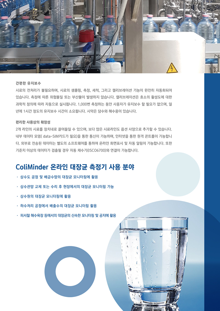 ÃøÁ¤ÇϰíÀÚ ÇÏ´Â ¹Ì»ý¹°ÀÌ °¡Áö°í Àִ ƯÀÌ È¿¼ÒÀÇ ´ë»ç¿¡ ÀÇÇØ ½Ã¾àÀÇ ±âÁú¿¡ ÀÖ´Â Çü±¤¹°ÁúÀÌ ºÐ¸®µË´Ï´Ù. ºÐ¸®µÈ Çü±¤¹°Áú¿¡ ƯÁ¤ÆÄÀåÀÇ ºûÀ» Á¶»çÇÏ¸é ¹ß»öµÇ´Âµ¥ À̰ÍÀ» °ËÃâ±â·Î Á¤·®È ÇÏ¿© mMFU/100ml ·Î ³ªÅ¸³À´Ï´Ù. ColiMinder¿¡¼ »ç¿ëµÇ´Â È¿¼ÒȰ¼º ¹× °ËÃ⠹̻ý¹°Àº ´ÙÀ½°ú °°½À´Ï´Ù. ¡¤ ´ëÀå±Õ (E. Coli) : beta-D-glucuronidase È¿¼ÒȰ¼º ¡¤ Àå³»±¸±Õ (Enterococcus) : beta-glucosidase È¿¼ÒȰ¼º ¡¤ Total bacteria : Alkaline phosphatase È¿¼ÒȰ¼º Á¦Ç° Ư¡ : 1. ½Å¼ÓÇÑ ´ëÀå±Õ ÃøÁ¤½Ã°£ 1ȸ ÃøÁ¤¿¡ °É¸®´Â ½Ã°£Àº 15ºÐÀ¸·Î¼, ±âÁ¸ ¹è¾ç¹ýÀÇ ÃøÁ¤½Ã°£ÀÎ 18½Ã°£~72½Ã°£¿¡ ºñÇØ ÃøÁ¤½Ã°£À» ȹ±âÀûÀ¸·Î ´ÜÃà½ÃÄ×½À´Ï´Ù. ÀÌ·¯ÇÑ ½Å¼ÓÇÑ ÃøÁ¤½Ã°£À¸·Î ÀÎÇØ ´ëÀå±ÕÀÇ Early Warning ½Ã½ºÅÛÀ¸·Î ÀûÀýÇÏ°Ô »ç¿ëµÉ ¼ö ÀÖ½À´Ï´Ù. ¸ð´ÏÅ͸µ ¸ñÀûÀ¸·Î ¿¬¼Ó ÃøÁ¤½Ã ÃøÁ¤½Ã°£Àº 15ºÐ, ¼¼Ã´½Ã°£Àº 9ºÐÀ» ÇÕÇØ¼ 30ºÐ À̳»¿¡ 1ȸ ÃøÁ¤À» ÇÒ ¼ö ÀÖÀ¸¸ç, ÇÏ·ç¿¡ 54ȸÀÇ ÃøÁ¤ÀÌ °¡´ÉÇÕ´Ï´Ù. Ãß°¡ÀûÀ¸·Î È¿¼ÒÀÇ È°¼ºµµ¿Í ½Ã·áÀÇ Åõ°úµµ ÃøÁ¤ÀÌ °¡´ÉÇÕ´Ï´Ù. 2. °£ÆíÇÑ À¯Áöº¸¼ö ½Ã·áÀÇ Àü󸮰¡ ºÒÇÊ¿äÇϸç, ½Ã·áÀÇ »ùÇøµ, ÃøÁ¤, ¼¼Ã´, ±×¸®°í ͏®ºê·¹ÀÌ¼Ç ±â´ÉÀÌ ¿ÏÀüÈ÷ ÀÚµ¿ÈµÇ¾î ÀÖ½À´Ï´Ù. ÃøÁ¤¿¡ µû¸¥ À§Çè¹°Áú ¶Ç´Â ºÎ»ê¹°ÀÌ ¹ß»ýÇÏÁö ¾Ê½À´Ï´Ù. ͏®ºê·¹À̼ÇÀº È¿¼ÒÀÇ È°¼ºµµ¿¡ ´ëÇÑ °úÇÐÀû Á¤ÀÇ¿¡ µû¶ó ÀÚµ¿À¸·Î ½Ç½ÃµË´Ï´Ù. 1,000¹ø ÃøÁ¤ÇÏ´Â µ¿¾È »ç¿ëÀÚ°¡ À¯Áöº¸¼ö ÇÒ Çʿ䰡 ¾øÀ¸¸ç, ÀÏ ³â¿¡ 1½Ã°£ Á¤µµÀÇ À¯Áöº¸¼ö ½Ã°£ÀÌ ¼Ò¿äµË´Ï´Ù. ½Ã¾àÀº ´ã¼ö¿Í ÇØ¼ö¿ëÀÌ ÀÖ½À´Ï´Ù. 3. Æí¸®ÇÑ »ç¿ë»óÀÇ È®À强 2°³ ¶óÀÎÀÇ ½Ã·á¸¦ ÀåÄ¡³»·Î ²ø¾îµéÀÏ ¼ö ÀÖÀ¸¸ç, º¸´Ù ¸¹Àº ½Ã·á¶óÀεµ ¿É¼Ç »ç¾çÀ¸·Î Ãß°¡ÇÒ ¼ö ÀÖ½À´Ï´Ù. ¿Â¶óÀÎ ¹öÀü À̿ܿ¡, ÇöÀå¿¡¼ »ç¿ëÇÒ ¼ö ÀÖµµ·Ï À̵¿Çü ColiMinder ¹öÀüµµ ÀÖ¾î¼ ´Ù¾çÇÑ ½Ã·á¸¦ 1ȸ~¼öȸ¾¿¸¸ ÃøÁ¤ÇÒ ¼ö ÀÖ½À´Ï´Ù. 4. ³»ºÎ µ¥ÀÌÅÍ ¸ðµ©( data-SIMÄ«µå°¡ ÇÊ¿ä)À» ÅëÇÑ Åë½ÅÀÌ °¡´ÉÇϰí, µ¥ÀÌÅͷΰŷΠRS232 Àü¼Û, LAN ¶Ç´Â Wifi Àü¼ÛÀÌ °¡´ÉÇϸç, ÀÎÅͳÝÀ» ÅëÇÑ ¿ø°Ý ÄÜÆ®·ÑÀÌ °¡´ÉÇÕ´Ï´Ù. ¿ÜºÎ·Î Àü¼ÛµÈ µ¥ÀÌÅÍ´Â º°µµÀÇ ¼ÒÇÁÆ®¿þ¾î¸¦ ÅëÇÏ¿© ¿Â¶óÀΠȸéÇ¥½Ã ¹× ÀÚµ¿ ¾Ë¸²ÀÌ °¡´ÉÇÕ´Ï´Ù. 5. ÃøÁ¤µÈ µ¥ÀÌÅÍ´Â Àü¿ë ¼ÒÇÁÆ®¿þ¾î¿¡ ÀÇÇØ ȸ鿡 Ç¥½ÃµË´Ï´Ù. ¶ÇÇÑ ±âÁØÄ¡ ÀÌ»óÀÇ µ¥ÀÌÅͰ¡ °ËÃâµÉ °æ¿ì ÀÚµ¿ ä¼ö±â(ISCO6700)¿Í ¿¬°áÀÌ °¡´ÉÇÕ´Ï´Ù. 6. ½Ç½Ã°£ ¿Â¶óÀÎ ÃøÁ¤ ¹× ½Å¼ÓÇÑ °ËÃâ·Î ó¸® °øÁ¤ÀÇ Á¦¾î µî¿¡ »ç¿ëµÉ ¼ö ÀÖÀ½ ÀÀ¿ë∙»ç¿ëºÐ¾ß : ¡¤ »ó¼öµµ °øÁ¤ ¹× ¹è±Þ¼ö¸ÁÀÇ ´ëÀå±Õ ¸ð´ÏÅ͸µ¿¡ Ȱ¿ë ¡¤ »ó¼ö°ü¸Á ±³Ã¼ ¶Ç´Â ¼ö¸® ÈÄ ÇöÀå¿¡¼ÀÇ ´ëÀå±Õ ¸ð´ÏÅ͸µ °¡´É ¡¤ »ó¼ö¿øÀÇ ´ëÀå±Õ ¸ð´ÏÅ͸µ¿¡ Ȱ¿ë ¡¤ Çϼöó¸® °øÁ¤¿¡¼ ¹èÃâ¼öÀÇ ´ëÀå±Õ ¸ð´ÏÅ͸µ Ȱ¿ë ¡¤ ÇǼö ÇØ¼ö¿åÀå µî¿¡¼ÀÇ ´ëÀå±ÕÀÇ ½Å¼ÓÇÑ ¸ð´ÏÅ͸µ ¹× °øÁö¿¡ Ȱ¿ë Á¦Ç°»ç¾ç :